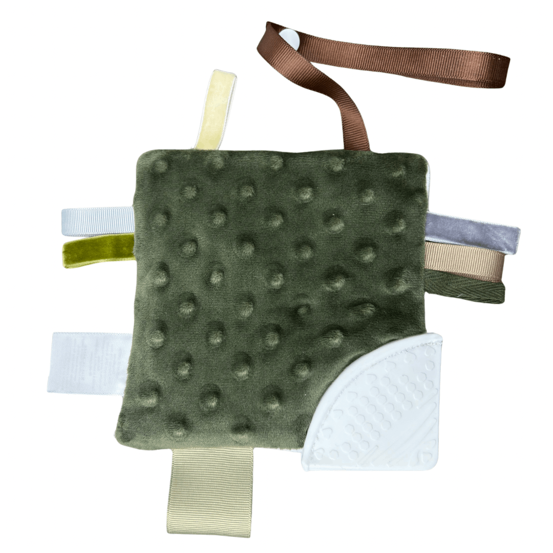 Forme et matériaux : Le jouet d'éveil dentition est de petite taille, carré, pour que le bébé puisse le tenir facilement. Il est fabriqué en minky avec un embout de silicone de qualité alimentaire sans bpa avec des matériaux sûrs à mâcher pour les bébés.