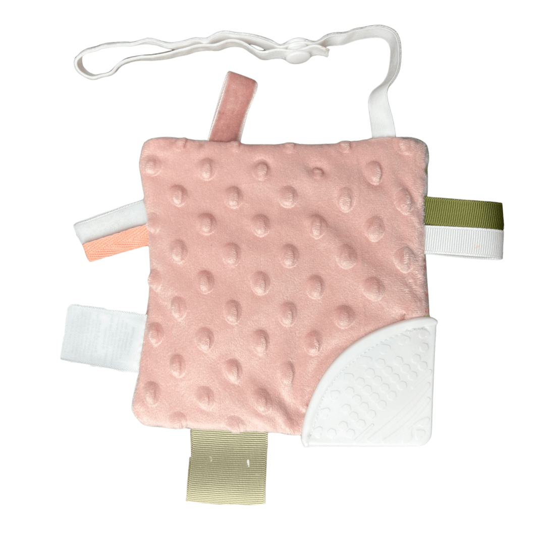 Forme et matériaux : Le jouet d'éveil dentition est de petite taille, carré, pour que le bébé puisse le tenir facilement. Il est fabriqué en minky avec un embout de silicone de qualité alimentaire sans bpa avec des matériaux sûrs à mâcher pour les bébés.